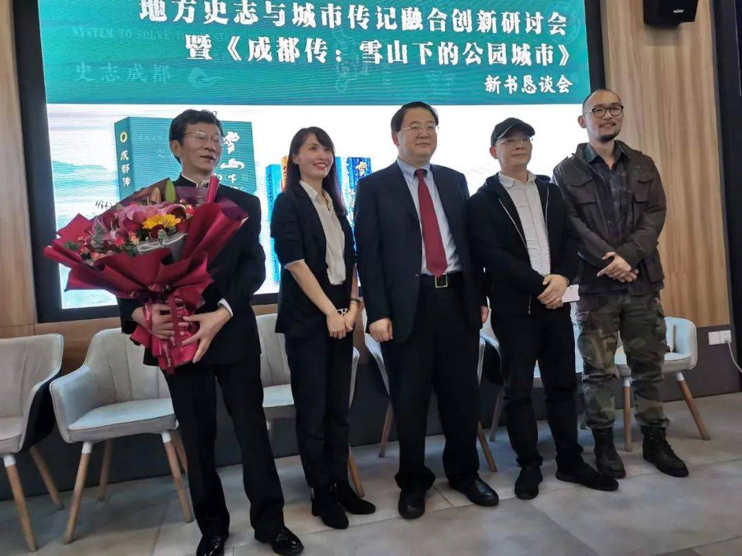 2021年 10月15日,易旭东(左一)在地方史志与城市传记融合创新研讨会暨《成都传·雪山下的公园城市》新书恳谈会上