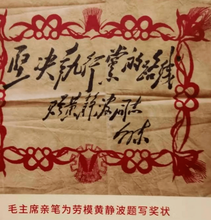 1942年10月至1943年2月,在党中央,毛主席亲自指导下,西北局在延安召开“高干会”。会议部署了边区政府工作,表彰了在大生产运动中作出杰出贡献的习仲勋、王震、马文瑞、王世泰、黄静波等22位生产英雄。毛泽东主席为22人逐个题写奖状,给黄静波的题词是“坚决执行党的路线”。