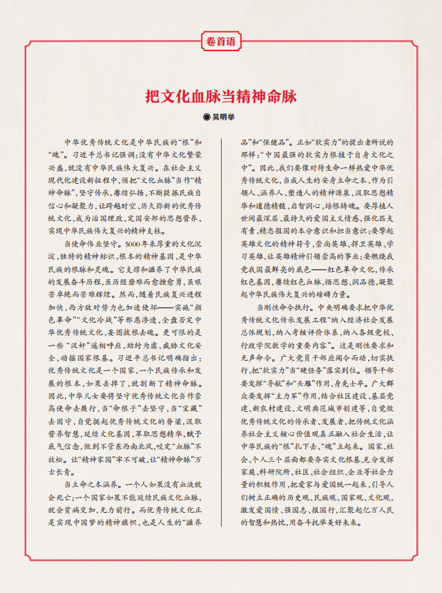 中华优秀传统文化是中华民族的“根”和“魂”。习近平总书记强调:没有中华文化繁荣兴盛,就没有中华民族伟大复兴。在社会主义现代化建设新征程中,须把“文化血脉”当作“精神命脉”,坚守传承,赓续弘扬,不断提振民族自信心和凝聚力,让跨越时空、历久弥新的优秀传统文化,成为治国理政、定国安邦的思想营养,实现中华民族伟大复兴的精神支柱。