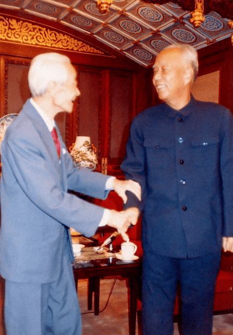 1985年9月4日,万里(右一)接见晏阳初(苗勇 供图)