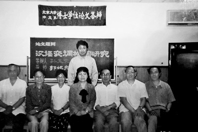 1997年孙玉文(后)博士论文答辩,一排左起:郭锡良、何九盈、何乐士、王宁、唐作藩、张双棣、宋绍年。图片为作者提供