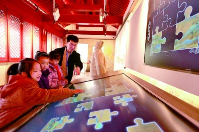 2023年1月,河南安阳滑县欧阳书院,小朋友正在完成《千里江山图》的拼图。视觉中国/光明图片