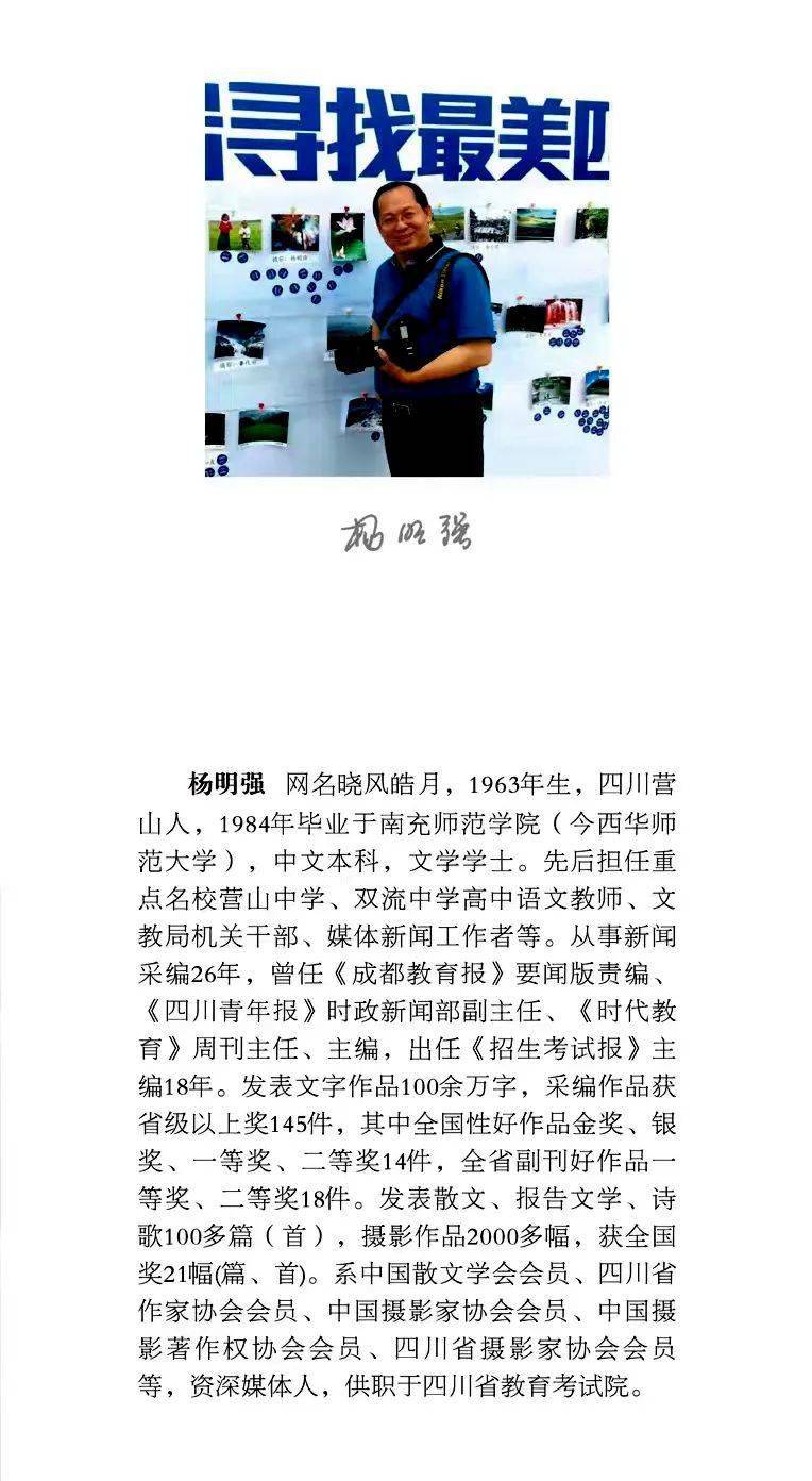 在我最初的印象中,身体健康、乐观向上、圆圆的脸上,盖着一副圆圆的眼镜,脸上总是洋溢着真诚笑意的他,坦诚、赤诚;他是很不错的资深摄影家,组织能力很强;这里,不妨看看他的简要履历:“笔名晓风皓月,1963年生,四川省营山县人,1984年毕业于南充师范学院(今西华师范大学)。先后担任重点名校营山中学、双流中学高中语文教师、文教局机关干部、多年的媒体新闻工作者,出任《招生考试报》主编18年,作品多篇多次获奖。”