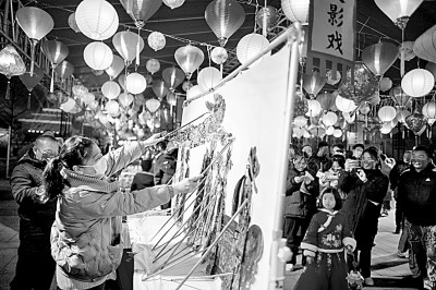 市民在湖北省博物馆的“钟鸣楚天元宵夜”灯会游园活动上体验皮影戏。新华社发