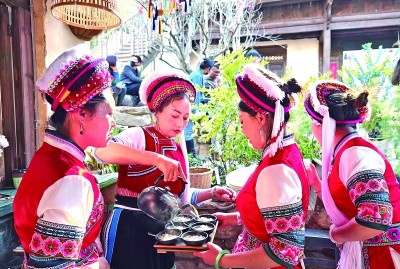 白族三道茶州级代表性传承人董丽(左二)率徒弟在云南省大理州凤阳邑有风小院展示白族三道茶。杨伟林摄/光明图片