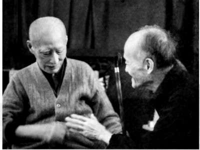 1987年秋,叶圣陶(左)在寓所与王泗原交谈。作者供图