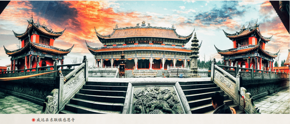 (七)宗教文化。威远寺庙众多,从八角庙、中峰寺、高峰寺等不少地名就可看出。目前保存完好的有宋朝古刹木瓜寺、佛尔岩大佛寺和感恩寺。佛尔岩大佛建于唐代,是世界现存最大的站立接引佛;感恩寺为川南建筑规模最大的寺庙。这几个寺庙都各有特点,是体验古老宗教文化的理想场所。
