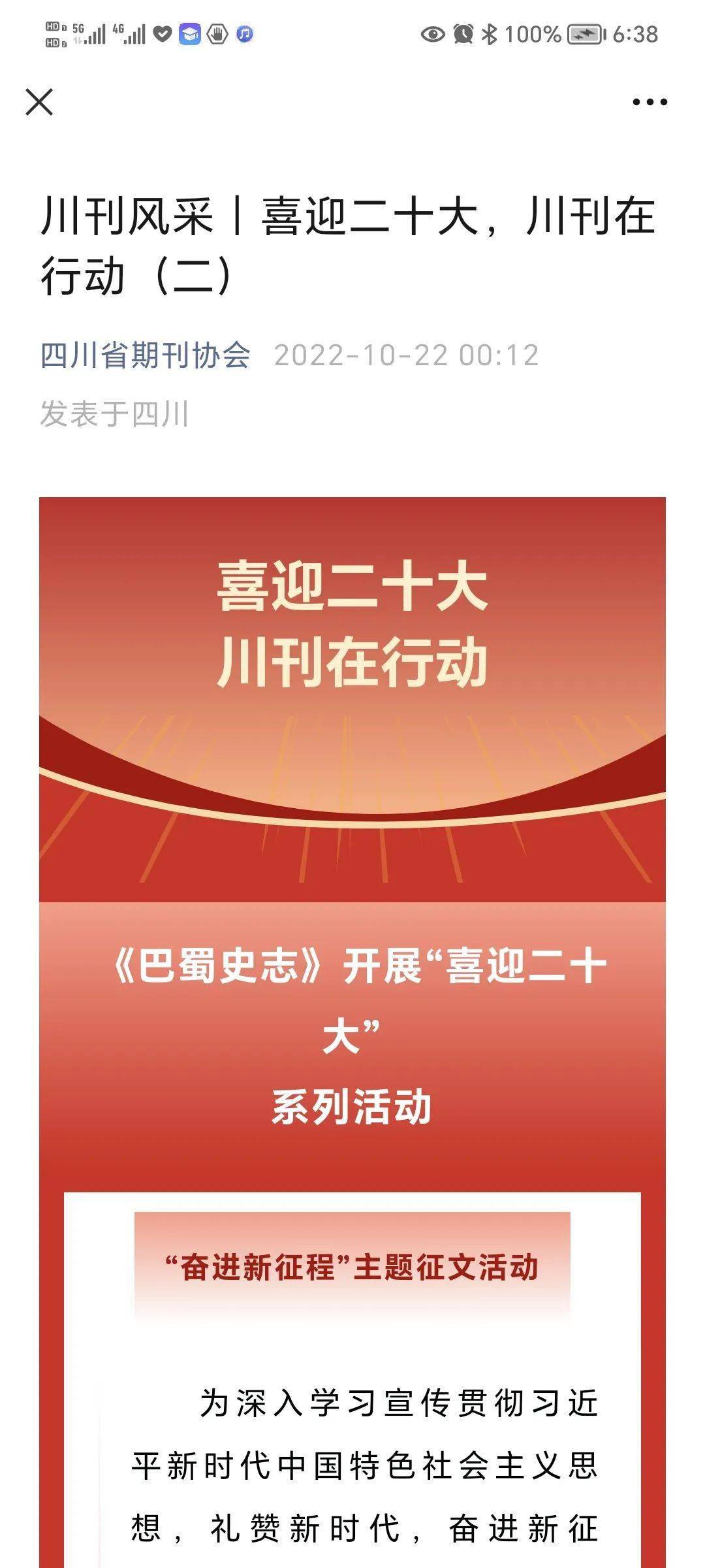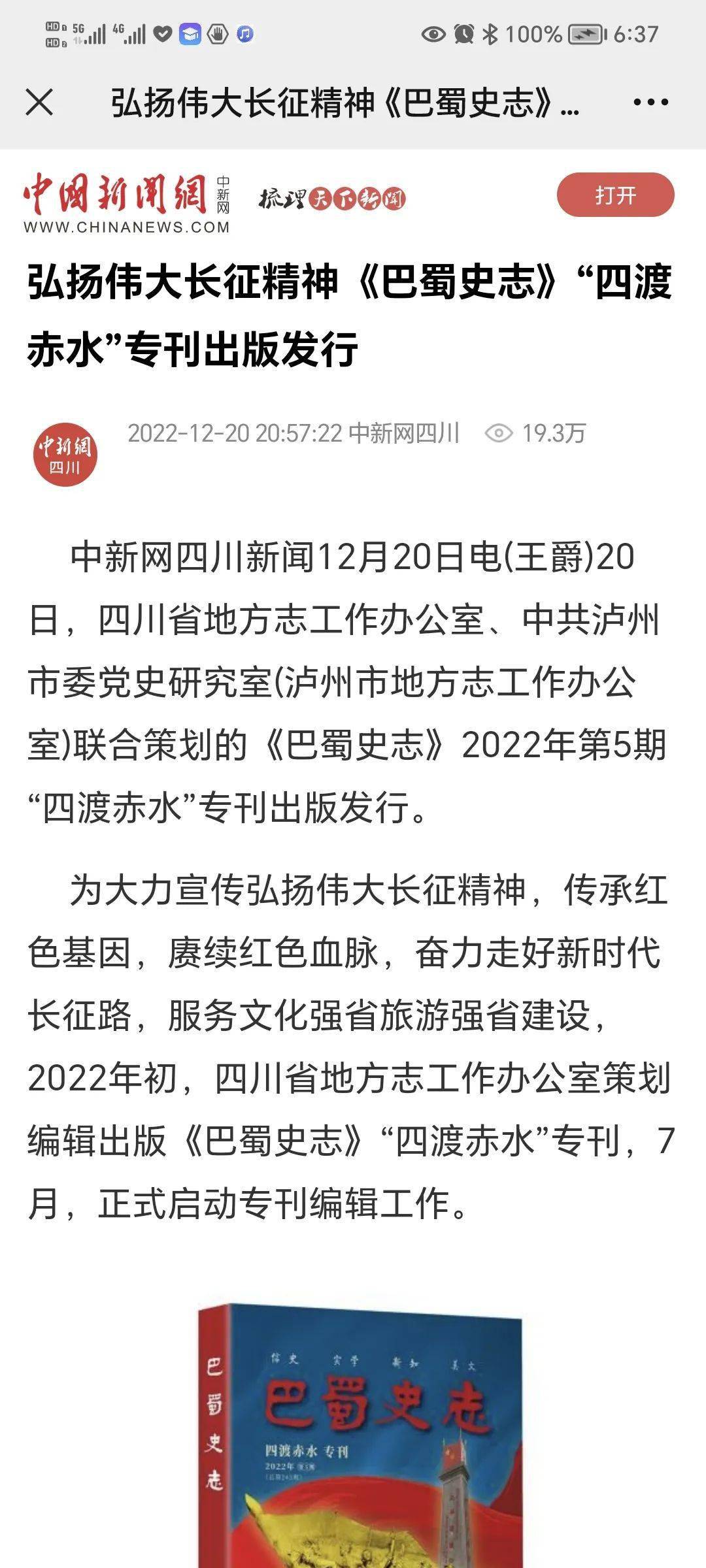 三是各类媒体广为报道。《巴蜀史志》编辑出版动态常被四川省人民政府网、中国方志网、中国新闻网、四川省期刊协会等有关部门网站、新闻媒体和微信公众号广为报道。如2022年10月22日,四川省期刊协会微信公众号报道《巴蜀史志》开展“喜迎二十大”系列活动。《巴蜀史志》“四渡赤水”专刊出刊后,2022年12月20日、12月22日、12月26日、12月27日,中国新闻网、四川省期刊协会微信公众号、中国方志网、“学习强国”先后以《弘扬伟大长征精神 〈巴蜀史志〉“四渡赤水”专刊出版发行》为题予以报道。