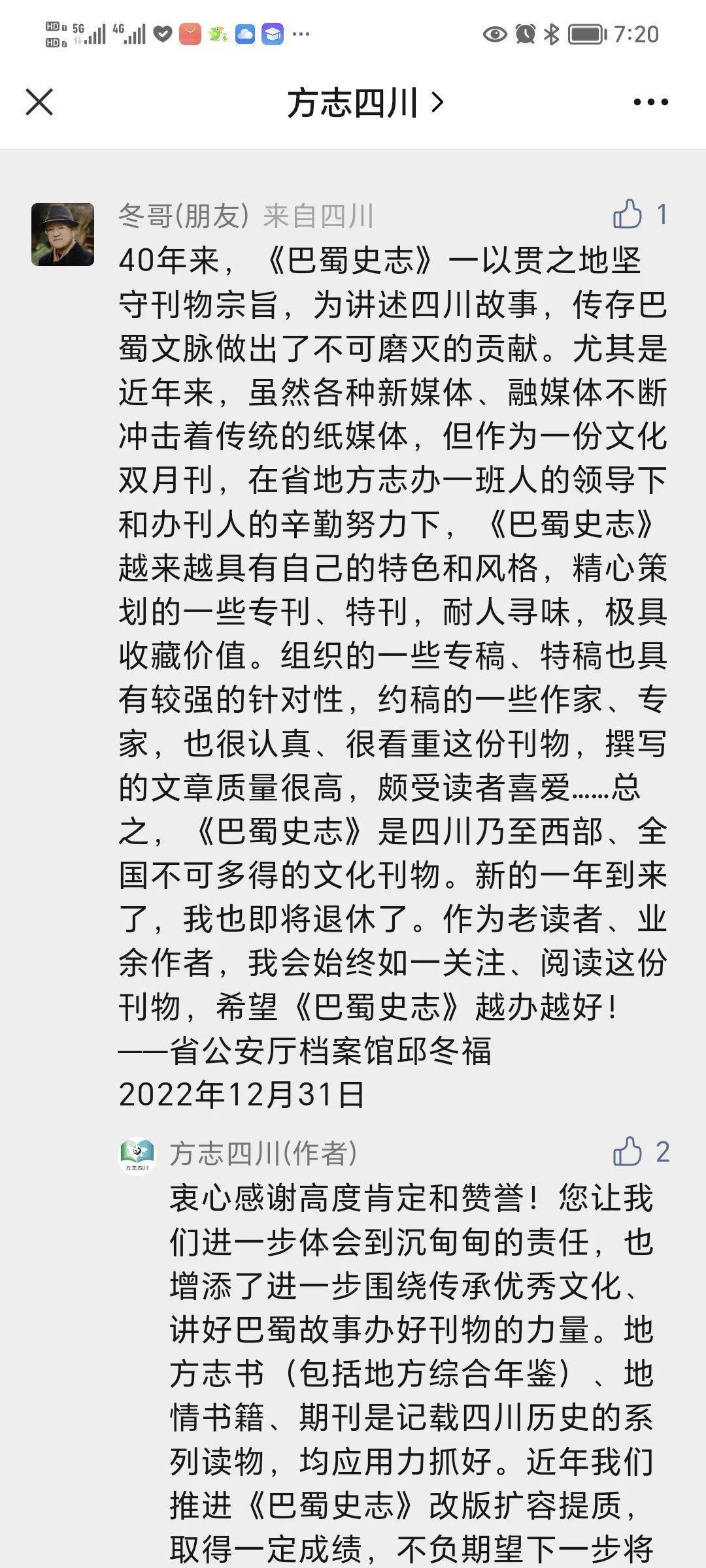 一是众多网友留言点赞。《巴蜀史志》各期出版推介在“方志四川”微信平台发布后,不少网友点赞留言。如2022年3月9日网友“晓风皓月”留言:“四川省地方志办主办的《巴蜀史志》杂志和‘方志四川’新媒体,其善作善为和务实创新精神,所产生的媒体传播力和影响力,深受广大读者钦佩和敬重。”2022年3月15日,网友“洪雅阿莲”留言:“《巴蜀史志》,与时俱进,涉猎广泛,记叙详实,图文俱美,留存了新时代的多面镜头。”同日,网友“朴刀客”留言:“《巴蜀史志》做到了思想性、学术性、知识性、趣味性的有机统一,值得细细品读。”2022年7月13日,网友“琨”留言:“《巴蜀史志》,鉴古而知今,展现巴蜀沧桑巨变;彰往而察来,凝聚中华奋进伟力。”2022年11月22日,《巴蜀史志》从全国近万种期刊中再次脱颖而出,入选中国期刊设计艺术周活动拟荐期刊(全国推荐206家,全国史志界推荐《巴蜀史志》《江苏地方志》2家),对此,11月23日网友“汪毅”留言:“期刊方阵星汉明,万家灯火几盏新。巴蜀文明传薪火,堪有史志鉴古今。”2022年12月22日,网友“前行”就《巴蜀史志》“四渡赤水”专刊出版发行留言:“这是贯彻落实习近平总书记‘用史实说话,增强表现力、传播力、影响力,生动传播红色文化’重要指示要求的四川担当、四川速度。”2022年12月31日,网友“文生”留言:“《巴蜀史志》,研究与弘扬巴蜀文化的主阵地!”同日,网友“唐及民”留言:“《巴蜀史志》,在专业刊物中独树一帜,讲述巴蜀历史,助力治蜀兴川!”同日,网友“冬哥”留言:“40年来,《巴蜀史志》一以贯之地坚守刊物宗旨,为讲述四川故事、传承巴蜀文脉作出了不可磨灭的贡献……《巴蜀史志》是四川乃至西部、全国不可多得的文化刊物。”
