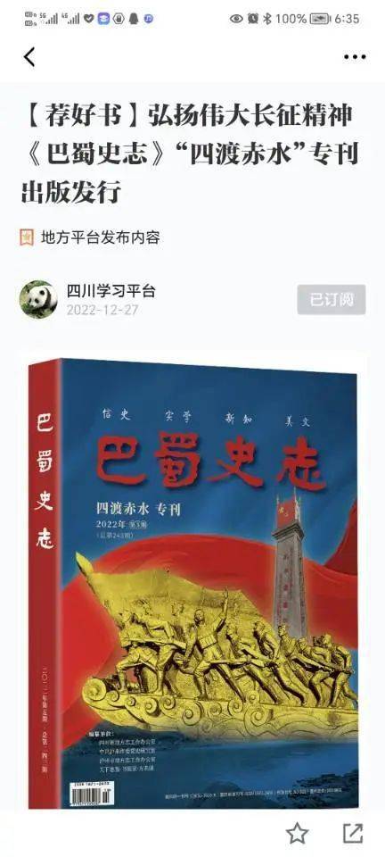 二是不少专家学者、机关干部转发盛赞。如2022年11月8日记者节,知名纪实作家、非学院派天府文化学者、北宋人物史研究学者易旭东在微信朋友圈转发2021年12月29日“学习强国”发布的文章《探寻巴蜀文明 弘扬中华文化——〈巴蜀史志〉“聚焦三星堆”专刊出版发行》并留言:“记者节,想起去年的同一时段,与专刊编辑团队共同作战,恍若在报刊从业时加班加点做专刊特刊时,夜以继日的编前会、定版会……实至名归。尽心,精心,用心!名副其实。”2022年12月27日,四川省委省直机关党校科研处处长宋键在微信朋友圈转发“学习强国”发布的《弘扬伟大长征精神 〈巴蜀史志〉“四渡赤水”专刊出版发行》一文并留言:“四川省地方志办近年来的专刊主题鲜明,主线突出,格局大气,设计新颖,图文并茂,具有很强的史料价值和学术价值。”