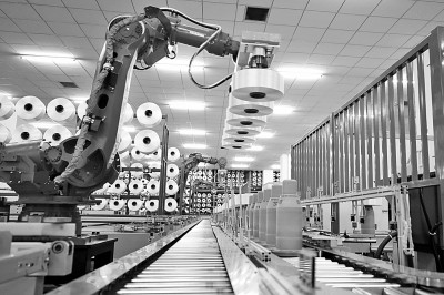 3月15日,在恒力(苏州)产业园内的高性能涤纶工业丝智能车间内,机械手臂在工作。新华社发