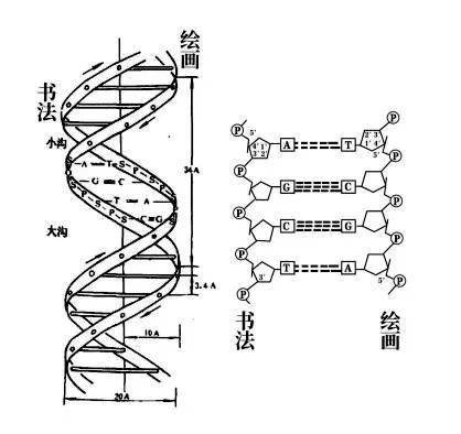 我们进一步分析,书画可找到类比物。遗传物质DNA(脱氧核糖核酸),由磷酸、五碳糖、碱基三种物质组成,分别对应书画的“三种境界”——笔法、笔势、笔意。书画中的“笔、墨、纸、砚”四种物质要素,在DAN中对应四种碱基,分别是A(腺嘌呤)、T(胸腺嘧啶)、G(鸟嘌呤)、C(胞嘧啶)。四种碱基配对原则是A-T,G-C,C-G,T-A,通过氢键相连接。核糖核酸RNA是单链,只能在局部回折中形成部分双螺旋结构,在RNA中T(胸腺嘧啶)被U(尿嘧啶)取代,就是A配对U。核苷酸链有5种元素:碳C、氢H、氧O、磷P、氮N,分别对应书画的初衷、笔画、形式、布局、情感五种个性特点。可见,书画与基因,三种物质、四个碱基、五种元素都有对应物和支撑体。似乎可以说,书画传承发展就是书画基因的遗传变异,因此要坚持守正创新,不忘祖宗,与时俱进。