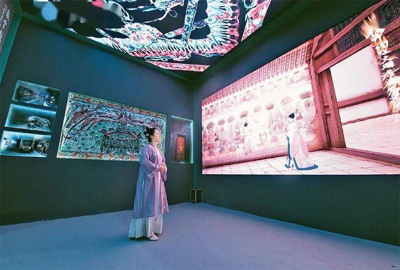 2023年6月8日,一名身着传统服饰的观众在第十九届中国(深圳)国际文化产业博览交易会甘肃展台观看数字敦煌展览(新华社记者 梁旭 摄)