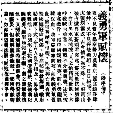 更不见当年暴秦势力莫与京,蚕食鲸吞肆兼并;又不见齐楚燕赵、日日纷争,坐令虎狼羽翼成。古今情事初不殊,大好河山强占据;异军苍头看突起,誓死抵抗无犹豫。白山黑水风凛凛,人乏饷糈马断饮;大呼杀贼向前进,转战不分昼与寝;冰天雪池寒澈骨,械弹两竭犹突奔;前扑后继胫膝没血,将军誓愿阵前殁。如此义勇气盖世,宁可秦越相坐视。匹夫兴亡与有责,投袂撄冠尚何俟。弦高犒师救郑国,输财助边汉卜式。今古人岂不相及?毋令后人笑我拙。吾闻海上花国选总统,敛钱将以饷义勇。须眉如何逊巾帼,对之能无增愧色。又闻救济难民特组游艺会,得资悉数酬赈灾。但冀解囊多慷慨,一举两得数善备。勿再观望与徘徊,同胞救国与乎来。