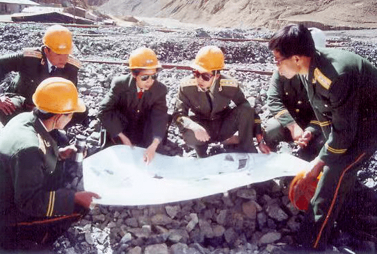长篇小说《涌动的羊湖》主人公原型——原武警水电三总队总队长方长铨首长(左三)与技术人员在研究工程施工图纸