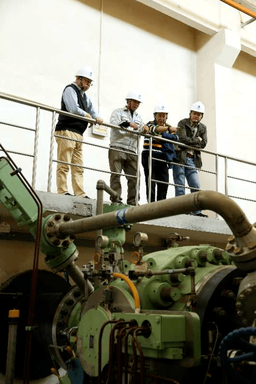 2020年8月23日,贺贵成(左一)在羊湖电站参观发电机组