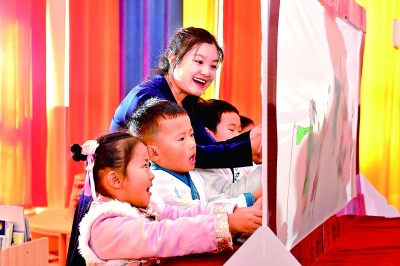 在山东济南市山望幼儿园皮影手工坊,老师教孩子们表演皮影戏。新华社发