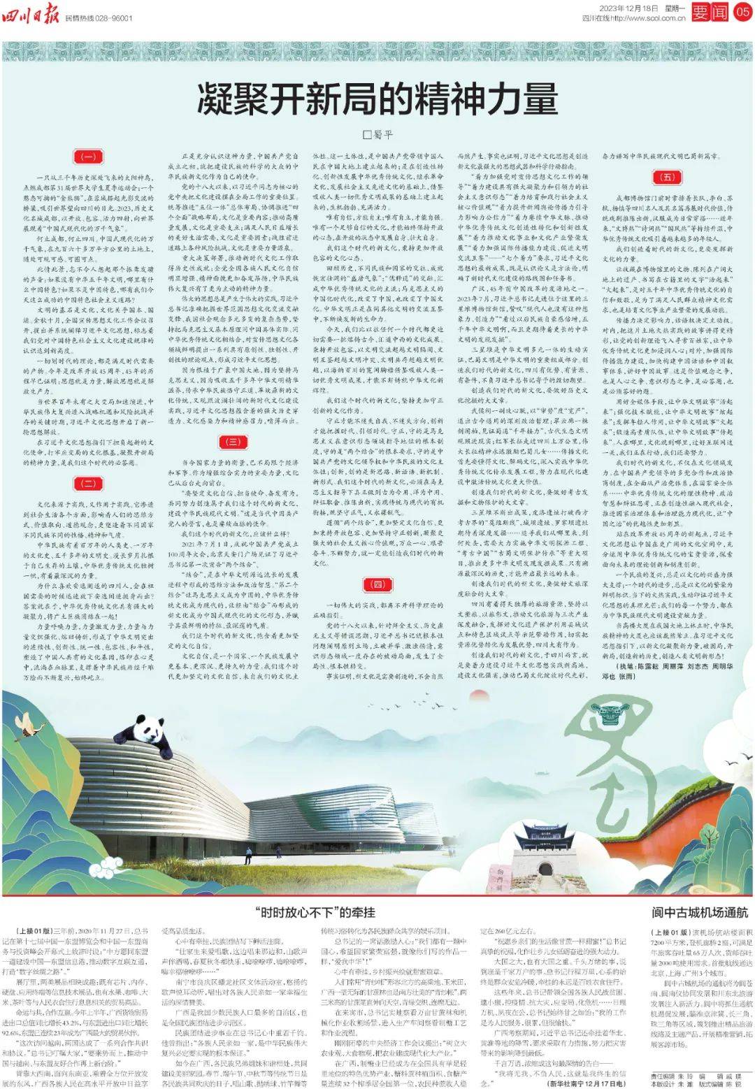 改革开放45年之际,2023年12月18日出版的《四川日报》发表署名“蜀平”的重要评论文章——《凝聚开新局的精神力量》。