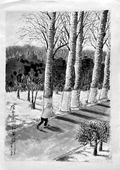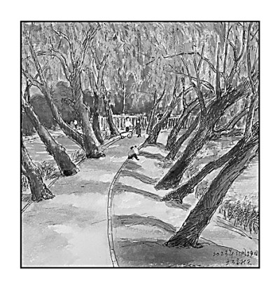 雪中的树林有着别样的美。高大的杨树擎着银色的枝杈,在风中轻轻地摇曳。苍绿的松枝上还顶着雪,光裸的枝干将影子投在雪地上。透过褐色的层层枝干望去,远处的树丛灰绿、棕褐相间,成为雪中树林的背景。偶有小动物出现,在雪地上踏出一串脚印,带着弧度伸向远方,最后消失在树丛中。路边向阳的椅子显然有人坐过,积雪被拂去,落在椅子的两侧,堆在灌木的根部。迎春的枝条上开始长出米粒般大小的花蕾,它们是紫褐色的,在雪的映衬下是那样鲜亮。