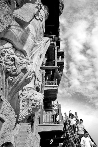 2023年7月30日,游客在麦积山石窟参观游览。新华社发