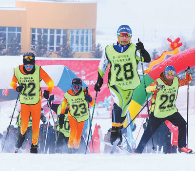2月13日,游客在新疆昌吉回族自治州昌吉市努尔加滑雪场游玩。陶维明摄(影像中国)