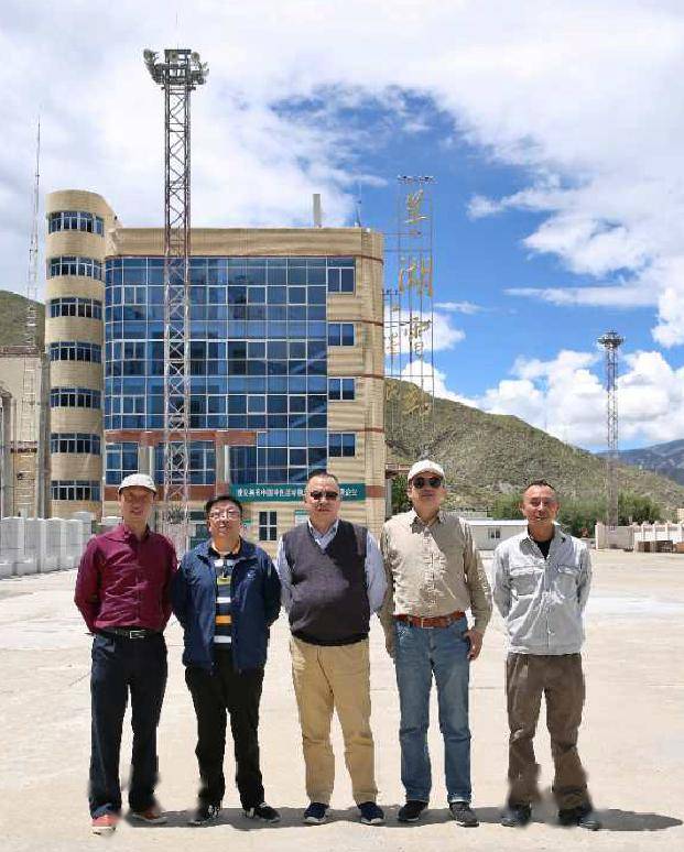 2020年8月23日,贺贵成(中)与首长熊任重(左二)、熊铧(右二)、肖琢凡(左一)和羊湖电站职工龚学伍(右一)在羊湖电站合影。