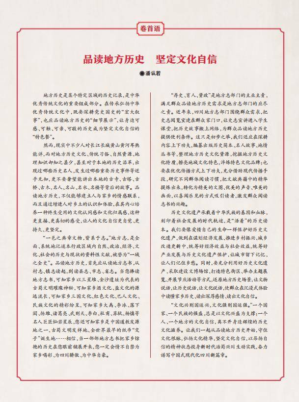 “文化兴则国运兴,文化强则国运强。”一个国家、一个民族的强盛,总是以文化兴盛为支撑;一个人、一个地方的文化自信,离不开身边辉煌的历史文化滋养。让我们一起从品读地方历史开始,守住文化根脉,弘扬文化精华,坚定文化自信,以昂扬自信的精神状态投身新时代治蜀兴川生动实践,奋力谱写中国式现代化四川新篇章。
