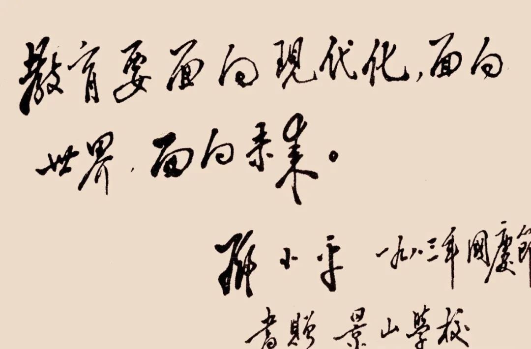 1983年国庆节,邓小平为北京景山学校题词:“教育要面向现代化,面向世界,面向未来。”根据当时《人民日报》的报道,北京景山学校组织该校教师认真学习了这一题词,并且准备在中国科学技术大学等单位的协助下全面试验改革该校的高年级教学,认为“当前的主要关键,就是尽快地培养造就一支革命化、年轻化、知识化、专业化的新型教师队伍”。为此,该校成立了一个“社会主义教育学研究会”,“以经常总结自己教学改革经验和了解世界各国教学改革的动向,探索、研究教育战略和教育理论问题”,“希望国内外教育家、科学家、艺术家给予指导”。