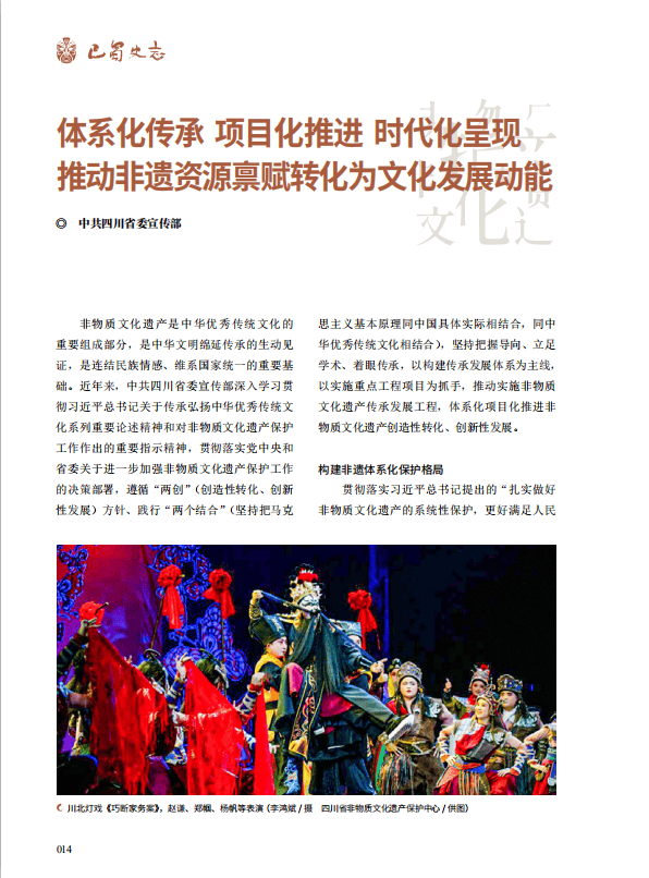 非物质文化遗产是中华优秀传统文化的重要组成部分,是中华文明绵延传承的生动见证,是连结民族情感、维系国家统一的重要基础。近年来,中共四川省委宣传部深入学习贯彻习近平总书记关于传承弘扬中华优秀传统文化系列重要论述精神和对非物质文化遗产保护工作作出的重要指示精神,贯彻落实党中央和省委关于进一步加强非物质文化遗产保护工作的决策部署,遵循“两创”(创造性转化、创新性发展)方针、践行“两个结合”(坚持把马克思主义基本原理同中国具体实际相结合,同中华优秀传统文化相结合),坚持把握导向、立足学术、着眼传承,以构建传承发展体系为主线,以实施重点工程项目为抓手,推动实施非物质文化遗产传承发展工程,体系化项目化推进非物质文化遗产创造性转化、创新性发展。