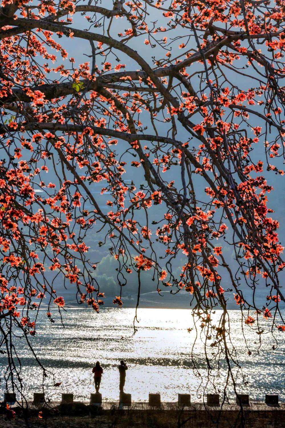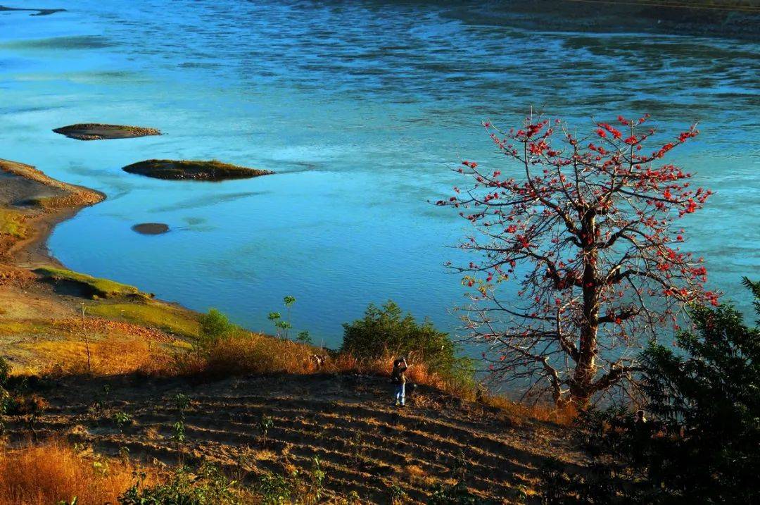 上午8点左右,从宾馆的斜坡上下来,趁着天凉首先站在了金沙江畔的渡口大桥上,这里视野开阔,风景如画。我看到,一片蓝天之下,群山突兀,峻峭的山体裸露在江水两岸。江水一色碧绿,绕山而流,夹江山脚下连片的楼房掩映在绿树带中。这时候树丛中的凤凰树花儿惊人,开得火红,一簇簇与绿树丛相映衬,点缀着江边的白色建筑群,也点缀着裸露的山峦,使荒芜的山峦因此显示出不少生机与烂漫。在渡口桥上,火红的凤凰花树给我留下惊奇的印象,以至在接下来的几天时间里,我发现攀枝花到处都盛开着的美丽凤凰花儿。