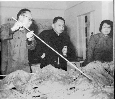 1965年,时任中共中央总书记、国务院副总理的邓小平在观看攀枝花钢铁公司厂区规划模型(图片来源:广安日报)