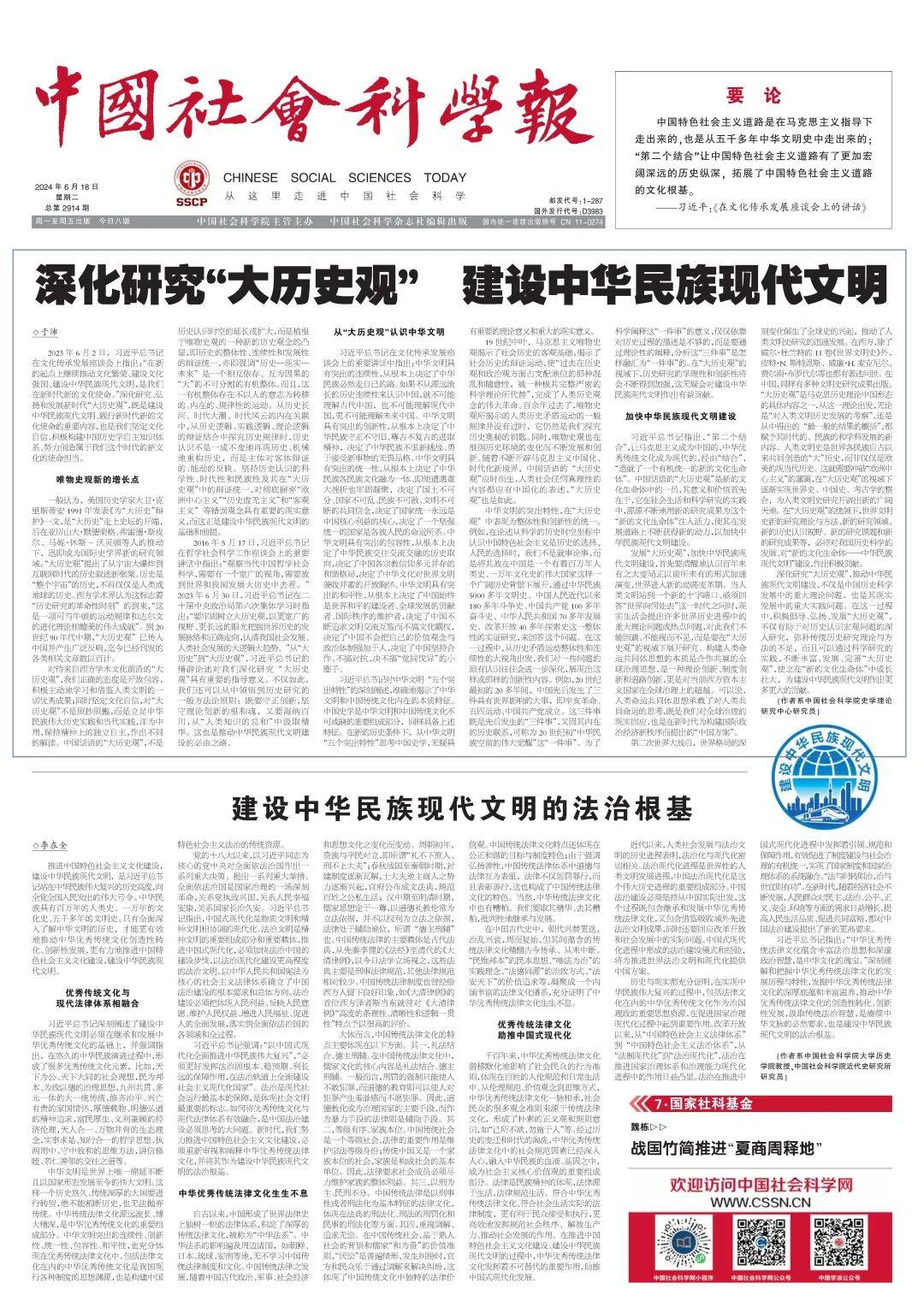 深化研究“大历史观”,推动中华民族现代文明建设,不仅是中国历史科学发展中的重大理论问题,也是其现实发展中的重大实践问题。在这一过程中,积极倡导、弘扬、发展“大历史观”,不仅有助于对历史认识宏观问题的深入研究,弥补传统历史研究理论与方法的不足,而且可以通过科学研究的实践,不断丰富、发展、完善“大历史观”,使之在“新的文化生命体”中成长壮大,为建设中华民族现代文明作出更多更大的贡献。
