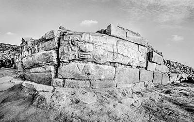 石峁遗址皇城台大型夯土建筑西南拐角神面石雕 资料图片