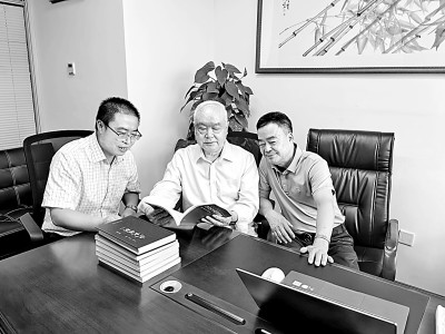 张大可(中)与中国史记研究会副会长丁德科(右)、秘书长丁波研究《史记疏证》编纂工作。丁波供图