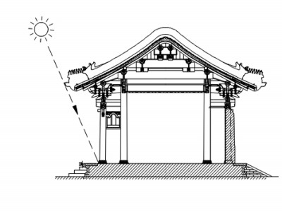 故宫古建筑的挑檐做法具有隔热作用。故宫古建筑屋顶檐部向外挑出(一般为柱高的1/3左右),并略带上翘的弧度,形成优美的曲线,这种做法称为挑檐。这种做法在夏季有利于避免阳光在正午时间照入室内。在夏季的北京地区,正午的太阳高度角约为73度。屋檐往外挑出的一定尺寸,使建筑外部的阳光照射达到某种特定的效果:在夏天且早上温度较低时,太阳高度角很小,阳光能够照射到建筑内部;随着室外温度升高,太阳高度角逐渐增大,阳光照射室内的范围逐渐减小;到了正午时分,太阳高度角达到约73度,阳光只能照射到檐柱外面,因而减少了传入建筑内部的热量。上述整个过程犹如对建筑的一个系统的降温过程,使得炎热的夏天屋内始终保持一丝凉意。