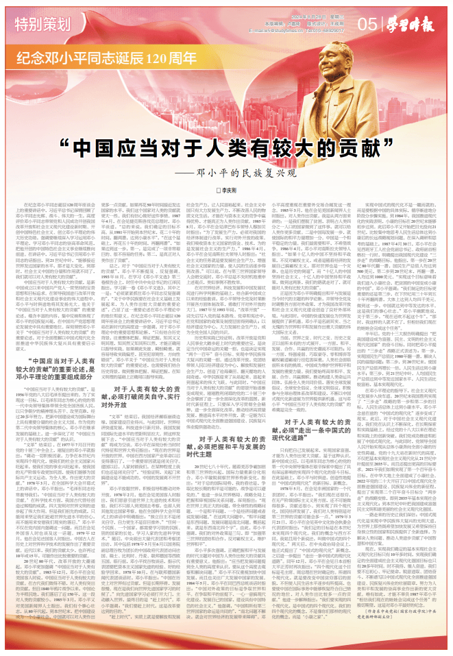 总之,对于“中国应当对于人类有较大的贡献”,邓小平不断提及 、反复强调。1993年11月,在学习《邓小平文选》第三卷报告会上,时任中共中央总书记的江泽民指出,学习新一卷《邓小平文选》,其中之一是:“必须紧紧抓住邓小平同志反复强调的”,“关于中华民族要在社会主义基础上发展起来,为人类作出较大贡献的重要论述”,凸显了这一重要论述在邓小平理论中的地位和意义。在纪念邓小平同志诞辰120周年座谈会上的重要讲话中,习近平总书记站在新时代的高度进一步强调,对于邓小平理论中的重要思想和论断,“只有结合历史背景,注重整体把握、辩证把握,知其义又明其理,知其然又知其所以然,才能正确用以指导实践。如果顾此失彼、畸轻畸重,就容易导致实践偏差,甚至犯原则性、方向性错误”。邓小平关于“中国应当对于人类有较大的贡献”的重要论述,也需要我们结合历史背景,做到整体把握、辩证把握,在知义明理的基础上正确用以指导实践。