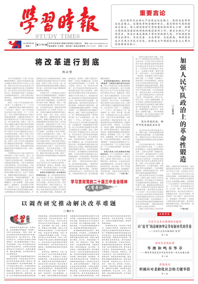 在学习贯彻党的二十届三中全会精神的热潮中,联系中华民族伟大复兴战略全局和世界百年未有之大变局,联系习近平总书记在纪念邓小平同志诞辰120周年座谈会上的重要讲话,深入领会以习近平同志为核心的党中央“将改革进行到底”的坚强决心和强烈使命担当,这对于我们坚定改革信心、增强改革责任感和紧迫感至关重要。