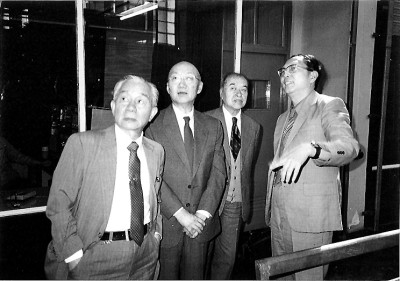 1988年,朱伯龙(右一)陪同美国国家工程院院士林同炎(左二)参观振动台实验室。作者供图