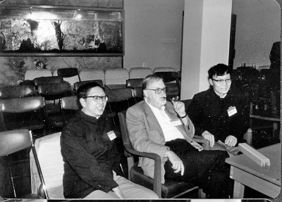 1984年,同济大学主办第二届地震工程会议,朱伯龙(左一)、吕西林(右一)与国外学者交谈。作者供图