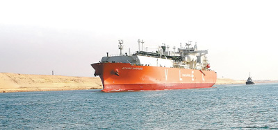 在埃及伊斯梅利亚省,一艘货轮行驶在苏伊士运河上。人民日报记者 黄培昭摄