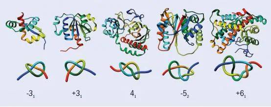 20世纪70年代,科学家发现了许多在拓扑意义上形成纽结结构的蛋白质(Knotted protein,也称打结蛋白),它们的天然结构呈现为开放的纽结,即两端不连接。尽管几何意义上,蛋白质(甚至DNA)可以看作一条(或几条)不闭合的曲线,但它们仍能形成纽结,从而影响其功能。事实上,在蛋白质数据库中,大约1%的蛋白质包含纽结结构。与绳子或线不同,每一个纽结蛋白质都具有一个特有的纽结。纽结蛋白质中最大的一类是SPOUT酶(它们组成了七类不同结构的甲基转移酶中的第二大类)。除了一种例外,其余所有SPOUT酶都形成了“三叶结”——三个环相互重叠的结构。纽结理论中目前最大的未解之谜仍是寻找完全不变量。现在,既然有了AI的助力,下一步的进展可能让我们感到惊讶。
