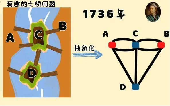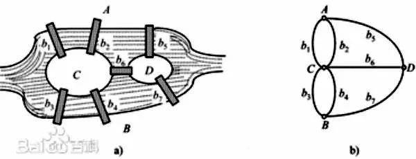 从几何的角度看,拓扑学的源头可追溯到1736年,L.欧拉(L.Euler,1707-1783年)发表了真正属于拓扑学的第一篇论文。该论文研究的问题源起于18世纪,即哥尼斯堡七桥问题。在数学上,关于哥尼斯堡七桥问题、多面体欧拉定理、四色问题等都是拓扑学发展史的重要问题。哥尼斯堡河上建有七座桥,将河中间的两个岛和河岸联结起来。人们闲暇时经常在这上边散步,一天有人提出:能不能每座桥都只走一遍,最后又回到原来的位置。这个看起来很简单又很有趣的问题吸引了大家,很多人在尝试各种各样的走法,但谁也没有做到。看来要得到一个明确、理想的答案还不那么容易。利用普通数学知识,每座桥均走一次,那这七座桥所有的走法一共有7 × 6 × 5 × 4 × 3 × 2 × 1 = 5040(种)七桥问题本质是“一笔画问题”。欧拉说此问题无解,且给出了连通图可以一笔画的充要条件是:奇点的数目不是0个就是2个(连到一点的数目如果是奇数条,就称为奇点;如果是偶数条,就称为偶点。要想一笔画成,必须中间点均是偶点,也就是有来路必有另一条去路,奇点只可能在两端。因此任何图能一笔画成,奇点要么没有,要么在两端)。七桥图形中,没有一点含有偶数条数,因此上述的任务无法完成。完成“一笔画”任务的先决条件——