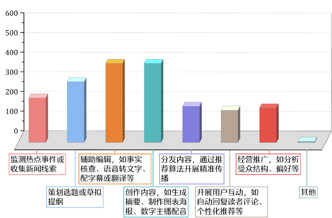 辅助生产,优化品质。人工智能的深度应用,让媒体人从大量重复琐碎的劳动中解放出来,专注于内容创新创意。在新闻生产环节,智能创作平台能完成语音转文字、自动剪辑、字幕生成、智能配乐、自动翻译、文本图片转视频等一系列工作,为媒体从业者提供更多辅助。课题组调查发现,在应用场景上,媒体机构目前探索较多的三个方向是辅助编辑、创作内容、策划选题。新华社自主打造的“新语”智能生产引擎在内容核查、态势分析、智能策划、智能创作等方面表现突出;人民日报推出的“创作大脑AI+”平台,集纳了近20款智能工具,可快速生成多模态新媒体产品,一站式完成采访、拍摄、直播、剪辑、发布等全流程工作。