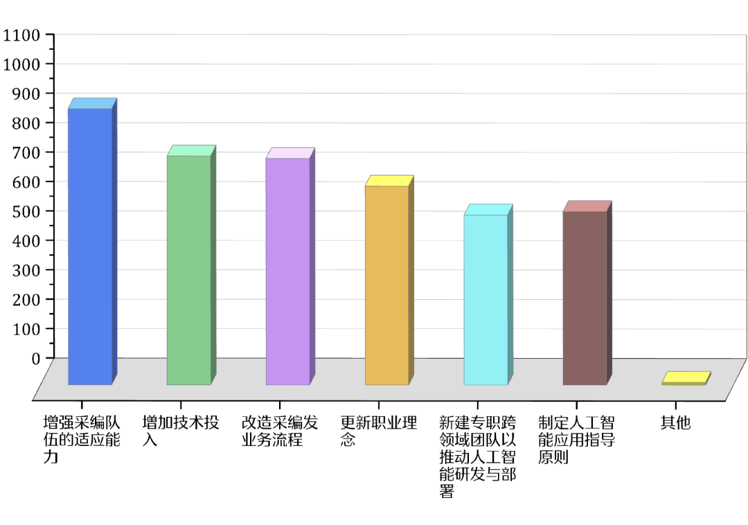 以智能化加强系统效能。新闻媒体要更注重自我技术赋能,构建人工智能支撑和驱动的生产传播体系、数据技术体系、组织管理体系、效果反馈体系,着力提升新闻媒体的传播力、引导力、影响力、公信力。要以智能技术为依托,提升新闻传播的速度、深度、广度和准度,增强新闻媒体连接社会、凝聚共识的作用。课题组调查显示,多数媒体机构认识到,生成式人工智能正以不可阻挡之势渗入传媒行业。对于如何应对变局,受访媒体机构认可度较高的三条路径是增强采编队伍的适应能力、增加技术投入和改造采编发业务流程。