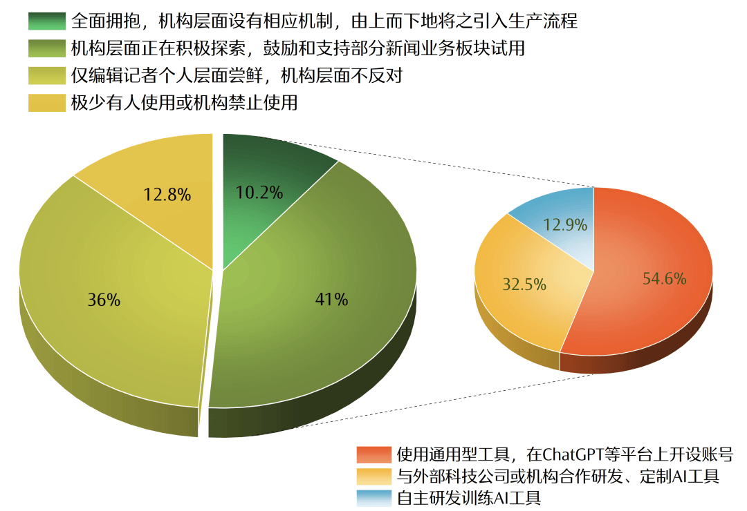 人工智能正在成为新闻媒体培育新质生产力、实现高质量发展的重要驱动力。课题组调查发现,全球已有10.2%的媒体全面拥抱人工智能,在机构内部建立了相应机制,由上而下地将人工智能引入生产流程;41.0%的媒体机构正在积极探索人工智能技术应用,鼓励和支持部分新闻业务板块试用人工智能技术。