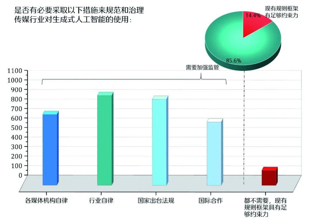 媒体不仅是新闻信息传播的桥梁和纽带,更是社会价值观的塑造者和守护者。人工智能时代,全球媒体要将新闻伦理贯穿于人工智能应用的全流程、全要素,健全以人为本的伦理规范体系,以人类主流价值驾驭“机器算法”。课题组调查显示,针对生成式人工智能在传媒行业的应用可能产生的负面效果,85.6%的受访对象支持以某种形式加强规范与治理。