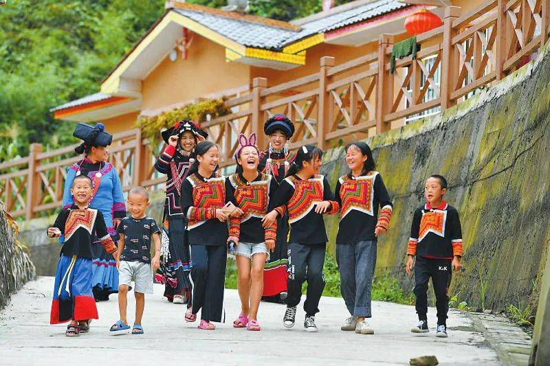 2020年8月12日,马边县荣丁镇后池村村民满脸笑容,漫步在新村中(何海洋 摄,图源:四川日报)