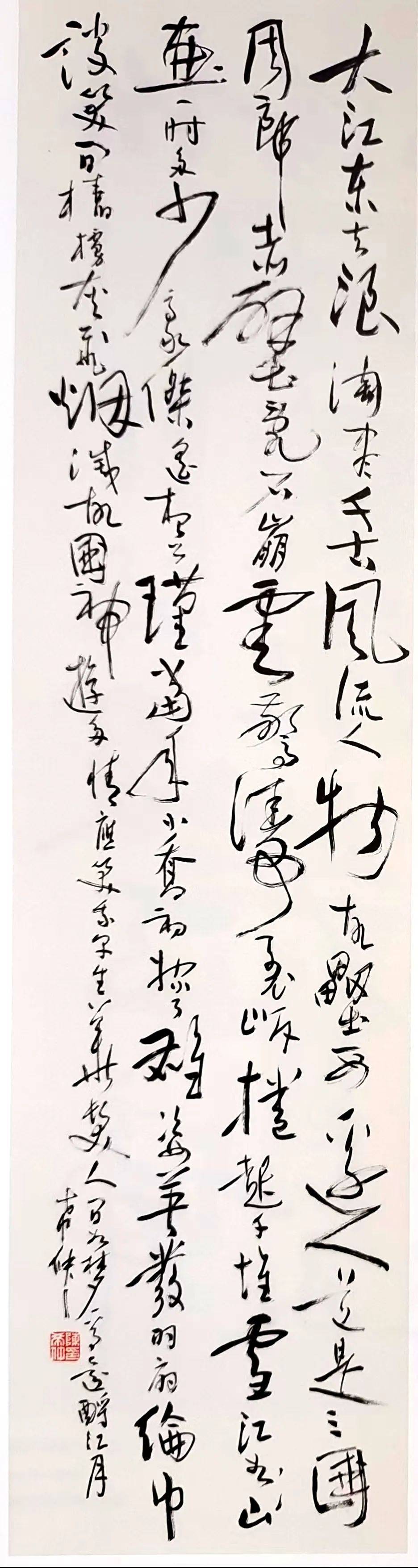暮岁书作老更成。暮岁书迹是其笔法博采众家及深沉的文学修养与器识人格冶炼的浑凝。以碑入草而雄强遒劲,以草化碑则腾宕飞天。晚年草书、行草书,愈加遒劲妍润,沉着流动。今品其耄耋之年所临兰亭、圣教,不难明白其自家风度是如何深得王逸少之气韵。又尚东坡的书卷味,山谷的诗剑气,于右任的敦朴气,赵熙的俊爽气,缶翁的金石气,阿寿的霸悍气。让人惊诧者还在,先生景仰苏轼的诗词、书画、人品,但其笔墨并未步入摹仿路径,而将对东坡骨子里儒雅、宽博、清朗超迈风神的崇敬融会于自己磨研的墨汁,倾注于宣纸,黑白之间烟云之际,又让人体会到少陵诗的沉郁顿挫,山谷诗书的剑气飘荡。其传递出的杜甫“瘦硬通神”审美取向,更多彰显了少陵、山谷的气骨,直抵“庾信文章老更成,凌云健笔意纵横”的沉着痛快及至奔放飞扬。观80岁前后多次书写的子瞻《念奴娇·赤壁怀古》和升庵《临江仙》,不断变化,终至笔力矫健,瘦劲浑凝,散朗含蓄,无拘无束,一气呵成,了无挂碍,行到该止,自然而然,直逼《史记·司马相如列传》所说“飘飘有凌云志气,似游天地之间意”,更兼一缕王维“行到水穷处,坐看云起时”的意韵。这才是其草书的逸品。耄耋老人手中笔墨,于此一瞬时混凝,让曹植《洛神赋》中“翩若惊鸿,婉若游龙”飘然而至,“余情悦其淑美兮,心振荡而不怡”。此种“不怡”不安之妙,妙在打通——打通了书法与文学、音乐、舞蹈等多种艺术门类,打通了古今,打通了书法与老庄,打通了书品与人品,打通了书家与天地、与自然、与宇宙洪荒。中国书法的线条之美,只属于每一个人,独特的时间、环境与心情,且存在诸多偶然。苏轼《论书》有谓“书无意于佳乃佳”,我以为并不适合每一个习书者,准确地说适宜于那些字外功夫深厚、胸中积厚且有神悟之学者书家。先生正是此类达人也。