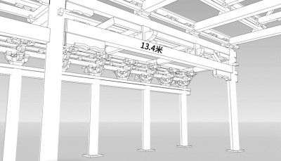 为了进一步认识佛光寺文殊殿的跨度和用材,我们可以把它们与故宫太和殿的同类情况对比一下。佛光寺文殊殿用的大约是宋金时期的木料,那时候的木料分为大料模方、广厚方、长方、松方、小松方、常使方、官样方、截头方、材子方、方八方等。其中大料模方、广厚方、长方、松方这些算作全条料,即整根原木采来,四方净一净,整个一条使用。而小松方以下的常使方、官样方、截头方、材子方、方八方等都是全条料切割开的,不太适合用作大梁。文殊殿那根14.2米的跨梁,长达40尺以上,高度是75厘米(2.5尺左右),可以算作广厚方。另外那根13.4米的小物料,具有广厚方的长度,却未采用广厚方的厚度。而太和殿中最长的物料是11.2米,比佛光寺文殊殿的第二跨还要短2.2米,这就足够让人惊讶了。如今的我们很难想象,当年修造文殊殿的工匠如此大胆,他们使用了一根小料,拼一拼、弄点榫卯,就敢撑起这么大的跨度。再进一步,我们可以想象当年的施工现场,工匠挑选这些木料时是不是如履薄冰?他们需要去触摸、去查看木料的情况,看看木料是否潮湿,还要敲击木料、通过声音判断有没有孔洞虫蛀。一位工匠在木料这端拿榔头敲敲,另一位工匠在那端摸一下感受振动情况,以判断木料是不是纹理通顺。我们甚至可以推测,当时的工匠需要调动所有的感官去挑选这么大跨度的木料,最终实现设计上这般的果敢,在近九百年后仍旧可以给我们极大震撼。