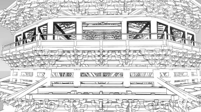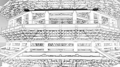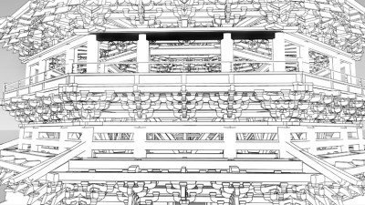 第二个因素,我们称之为刚柔相济的层叠结构。应县木塔除了“筒中筒”结构外,还有许多层次上强度非常大的部分,许多木头紧密累叠、咬合在一起,形成刚性层。木塔的刚性层很多,例如立柱上的一圈叫铺作层,平坐上面的平坐铺作层,以及平坐柱——即平坐里面的柱子,有好多斜撑撑着它,这些都是刚性层。不过刚性过大,会导致摇晃起来吸收地震力的能力不够强,因此还需要柔性层的配合。柔性层简单来说就是立柱层,尤其是明层的立柱。这些立柱顶部支撑着刚性层,底部也“踩”在刚性层上。当地震来临时,这些立柱随之摇晃,并且由于上层刚性层的荷载,它们具有相当强的自恢复能力。